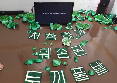 Curator’s Intention: Human civilization is built on nature, and we are living by exploiting nature without any doubts. “The clover field” in the Daehyeon-dong Clover Murder Case symbolizes “Peace”. The field on the side of APM Park in Daehyeon-dong is found trampled brutally. The suspects were Kim To-ji, Jo Jae-bi and John B. Human police interrogated them, but the culprits were a human couple, not the animals on the suspect’s list. But the culprits were confused not knowing what the problem was. They said their parents taught them how to make clover rings and crowns (or they knew it by searching on the Internet), and they made the crowns and rings by tearing down the clovers to win his lover’s favor. Humans have enjoyed the convenience of civilization without any doubt like this. And there has been a series of victories. A criminal who tore ‘peace’ apart smiles with a pure face. Whether we knew it but pretended we didn’t, or really didn’t. The criminal is human. We take a short break in parks. The park itself, which is created for good views in cities, may be deceptive. Because humans broke down the original form and built a “bright” civilization on it. It is a contradiction of human beings who want to live with nature while trampling on it at the same time. Most people who come to parks will not find any problems when they see spaces which are imitating nature. As if the way to make clover rings and crowns passes down to their descendants. Yes, as long as we’re born, we live by stepping on someone or something. Whether it’s nature or someone like us. If we talk like this, someone might ask “you’re going to break up with the world?” One might accuse “Isn’t the art installation material also the result of exploitation as well?” Nevertheless, the reason for doing this work is because I don’t want to end up thinking of defeatism and skepticism. We want to live with awareness continuously. We want to train in the process of making work. And we believe someone will be inspired by us. At the same time, it is the least conscience excuse of the cowardly.