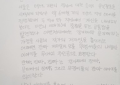 Gang Ga-jja and Moon Ga-jja are artists who have an interest in women’s life history and gendered symbols, respectively. They began their unit activities with interest in text-based work. After about six months of text-work study, both artists found common ground in their work focusing on other people’s stories rather than putting themselves forward. In this exhibition, Gang Ga-jja and Moon Ga-jja use the pseudonym to disperse the author’s self-esteem and call the inner story of the unknown, possibly the real author, as the main characters of the stage. Jin-jja, Jin-jja, Jin-jja(Real, Real, Real) means the real story of Gang Ga-jja, Moon Ga-jja and the unknowns. We are going to make an uneasy, real confession of the two Ga-jjas who might be stealing other people’s stories instead of theirs.