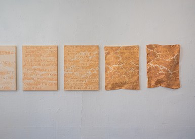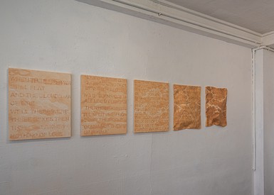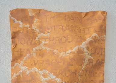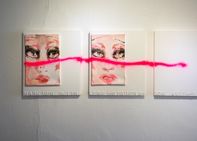 텍스트가 나열된 일련의 (비)회화 연작은 물감이 아니라 파운데이션(화장품)으로 제작되었다. 마치 성경의 구절을 필사한 것처럼 보이는 이 작품 속 문구는 사실 뮤지컬 헤드윅의 수록곡인 ‘사랑의 기원(The Origin of Love)‘의 가사이다. 주지하다시피 ‘사랑의 기원’은 플라톤의 저서 『향연』에 등장하는 아리스토파네스의 연설 속 내용을 각색한 곡이다.